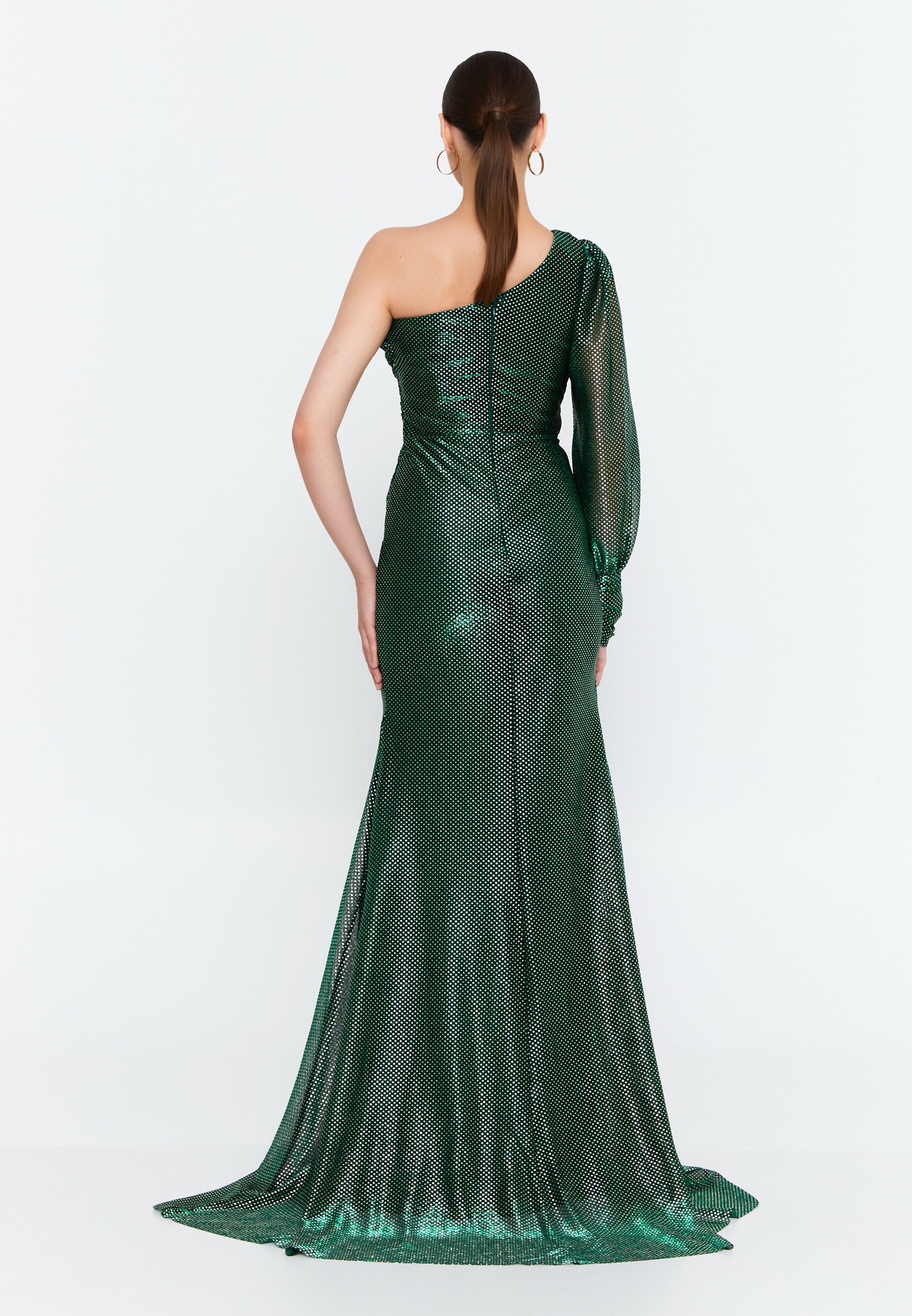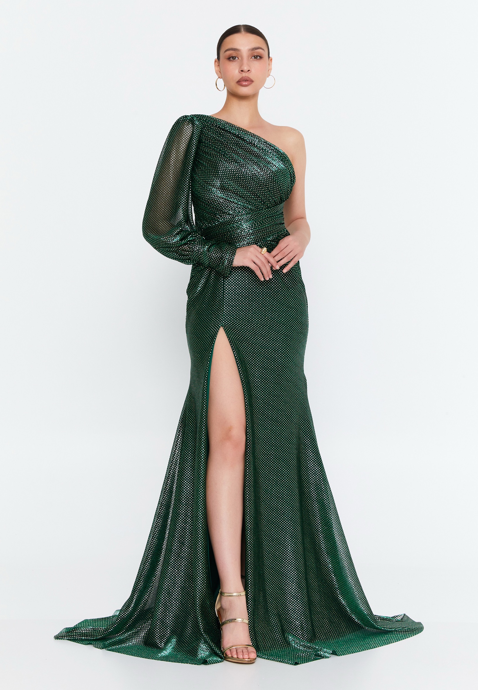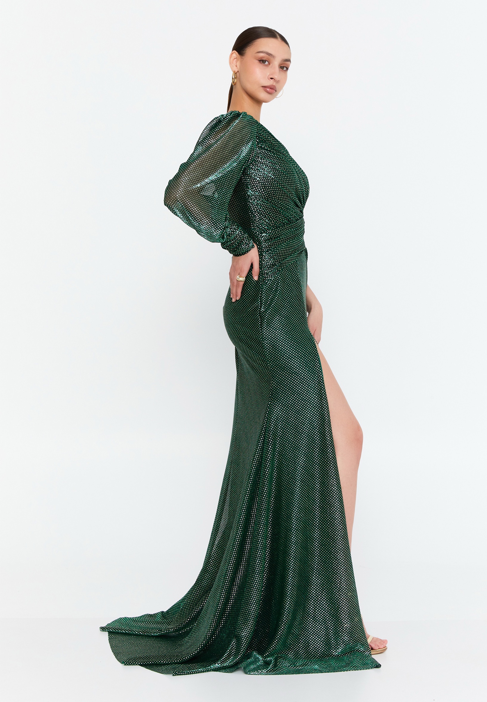 Unveil your inner icon with the AW Celestial Glimmer, a dazzling one-shoulder gown that defines modern luxury. Crafted in stretch metallic fabric with a deep emerald hue and subtle shimmer, this gown features a sheer puffed sleeve, a flattering ruched bodice, and a thigh-high slit for elevated drama. Perfect for unforgettable nights under the spotlight.