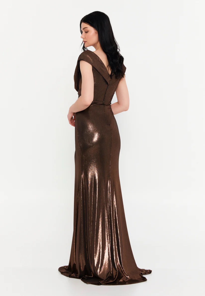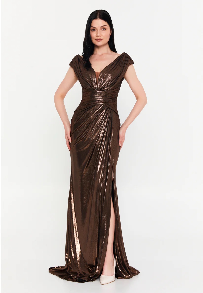 Designed with a deep V-neckline, soft cap sleeves, and a high-slit draped skirt, this gown exudes glamour from every angle. The rich mocha-bronze shimmer fabric hugs the body beautifully, making it a bold choice for evening grandeur