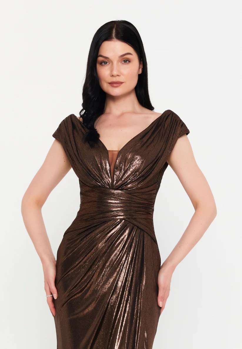 Step into elegance with the AW Mocha Radiance gown — a figure-enhancing metallic masterpiece.